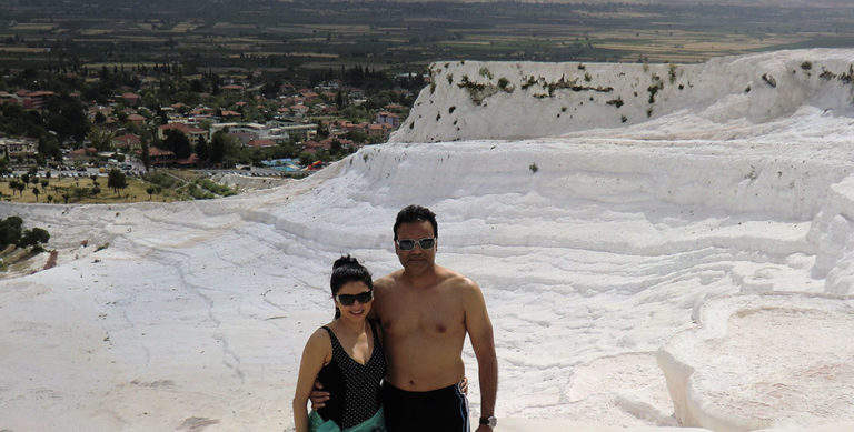 Pammukale means cotton castle, the limestone covered mountain looked more like ice formations in Iceland. The terraces formed on the slopes were filled with milky blue water. The limpid pools