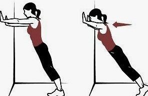 5. Scapula push ups : Stand facing the wall with your palms against the wall. Maintaining your arms straight, squeeze the scapula muscles together and push against your chest towards the wall and back slowly. Start with 10 repetitions.