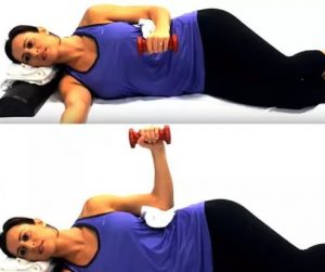 4. Internal Rotation : Lie on your right side, right arm outstretched away from your body and lift your right hand to form a 90* angel , Now gradually lower your hand maintaining the 90* angel at elbow. Start with a repition of 5 and then gradually add resistance using a 500ml water bottle / 2 pound dumbbell. Eventually you can upgrade to using the theraband for more resistance and to build up strength for both internal and external rotation.