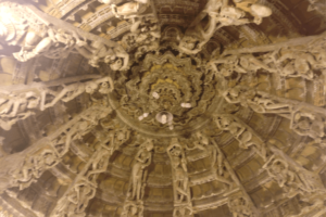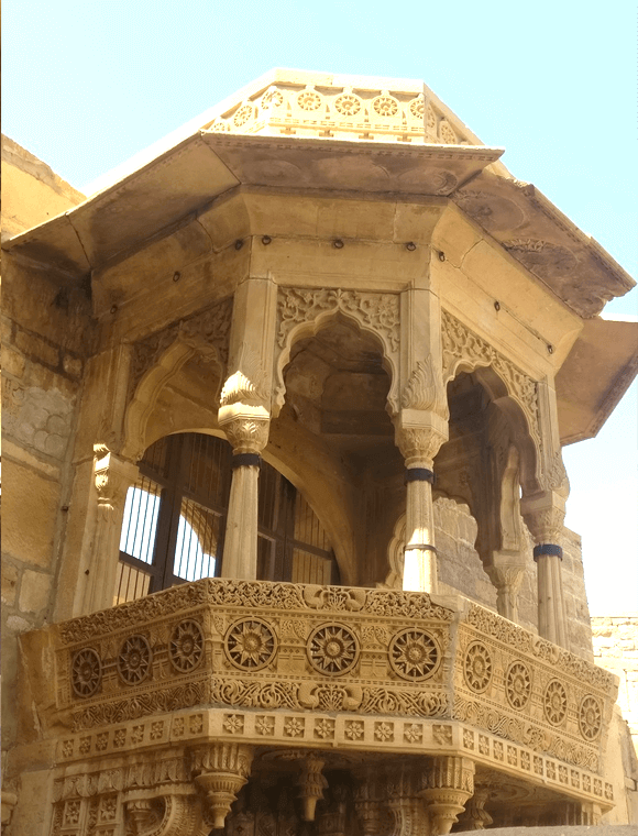 Day one, I couldn’t wait to get going. Atop a small hill, the Sonar Quila (Jaisalmer Fort) overlooks the entire city. As one of the largest fortified cities in the world, it is declared a heritage site and a visual delight. The massive structure holds not only several residential quarters but also many prominent Jain temples of exquisite beauty, the Shiv-Ganesh Temple as well as a museum of royal heritage splendor. The fort has also many shops of silver jewelry, books, clothes and many eateries. I was surprised to see several restaurants that had Italian cuisine. Perhaps to cater to the European tourists. The fort is kept clean and it is a delight to walk around, tinkering with the wares so neatly laid out by the enterprising tribal women. The Jain Temples with their intricate detailing are a sheer magnificence of artisanship. The structure itself is made of the yellow sandstone with artwork of fossil stone and marble base. The idols of the 24 tirthankars are each made of different metals/stone. One could actually spend an entire day understanding the history behind each of them, but hunger pangs beckoned and we returned to the entrance of the fort where Restaurant Jaisal was situated.
